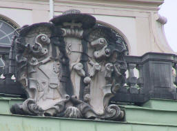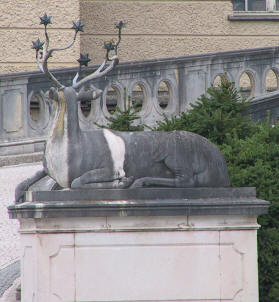 Vor den Auffahrten liegen je zwei marmorne Hirsche, deren Geweihe mit vergoldeten Sternen besetzt sind. Sie wurden 1732 von Johann Anton Pfaffinger geschaffen und stellen die Wappentiere des Erzbischofs Firmian dar. Besonders repräsentativ ist der Mittelteil der Fassade gestaltet. Er besteht aus einem dreiachsigen Risaliten, an den sich zwei einachsige Zwischenglieder anschließen. Ursprünglich war eine Öffnung des Mittelteiles vorgesehen, so dass der dahinter liegende Festsaal wie ein Gartenpavillon gewirkt hätte. Da dies aber unseren klimatischen Verhältnissen nicht entsprach, wurde Fischers Entwurf mehrfach abgeändert. Nun öffnen sich im Obergeschoß drei hohe rundbogige Türen auf die 1732 hinzugebaute Terrasse. Das Gebäude wird von einer Attika abgeschlossen, in deren Mitte sich ein großes, dreifaches Wappen (Salzburg, Erzbischof Thun und Erzbischof Harrach) befindet. Es wurde 1717 von Michael Bernhard Mandl geschaffen. An den Mittelteil schließen sich zwei fünfachsige, vortretende Seitenrisalite an. An deren Rückseiten sind schmale, wie Türme wirkende Flügelbauten angesetzt. |