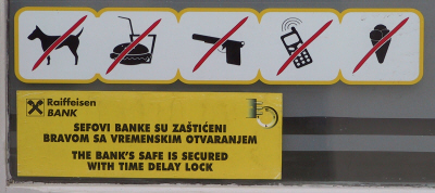 Das dies jedoch alles relativ ist, zeigt sich an Kleinigkeiten. So zB ein harmloses, aber völlig gewöhnliches Schild an einer Bank, das darauf hinweist, wie der geehrte Kunde bitte nicht in die Bank kommen soll. |