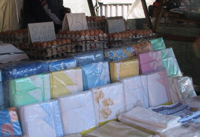 | Ein Brautmodengeschäft | An diesem Stand gibt es Handtücher - und Eier. |
