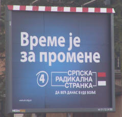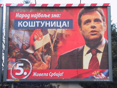 "Das Volk weiß am besten: Koštunica! Es lebe Serbien". Das Bild zeigt eine Demonstration und die serbische Flagge. Das Mädchen im Tarnhemd ist in serbischen Nationalfarben geschminkt. Das Photo von Koštunica ist ebenso unscharf wie seine Politik. |