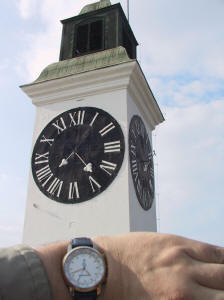 Das Städtchen Peterwardein am Fuß der Festung hat auch alles Militärische verloren. | Der Uhrturm, ein Wahrzeichen der österreichischen Verwaltung. Heute ist der Uhrturm sogar das Wahrzeichen von Novi Sad. Die Besonderheit: wegen der besseren Lesbarkeit zeigt der große Zeiger die Stunden und der kleine die Minuten. Und angeblich mußten alle Bewohner, die auf Sichtweite der Festung wohnten, eine Uhrsteuer zahlen ... |