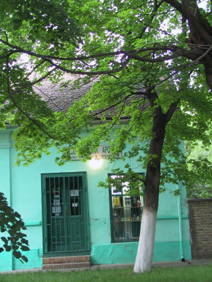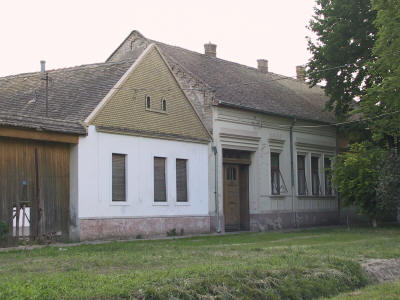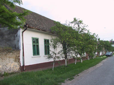 | Das Gebäude ist heute das Kulturhaus | Die Straße im Maria-Theresianischen Stil mit Straßengraben und Rasenstück oder Blumenbeeten vor den Häusern. |