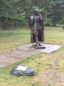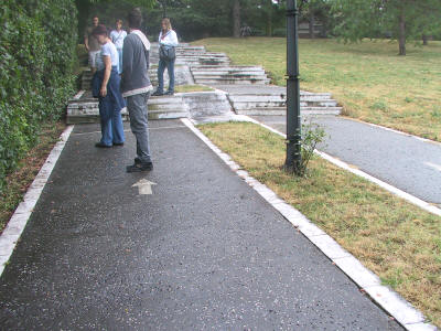| Die Wege im Park sind gekennzeichnet, damit sich die Menschenmassen zügig und störungsfrei bewegen können. Links geht es nach oben, rechts geht es abwärts. | Eine Statue des Staatsführers. |