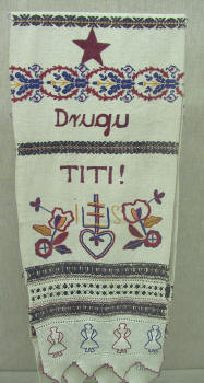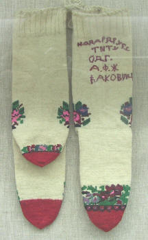 | Diese Geschenke kamen nicht nur von ausländischen Gästen, sondern auch von der einheimischen Bevölkerung. Die Frauen der antifaschistischen Frauenfront fertigten zahlreiche traditionelle Handarbeiten für den "Drugo Titi" (lieben Tito) an wie hier Socken oder Handtücher. | |