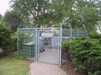 This is a garbage bin in Germany close to an apartment building. Protected by a strong fence with some barbed wire on top. Some bins are secured with a lock. This makes some sense: Someone could come and throw something in. Some bad guy who throws his garbage in the bin of someone else, who is stealing garbage space and cheating on the garbage duty that he has to pay. |