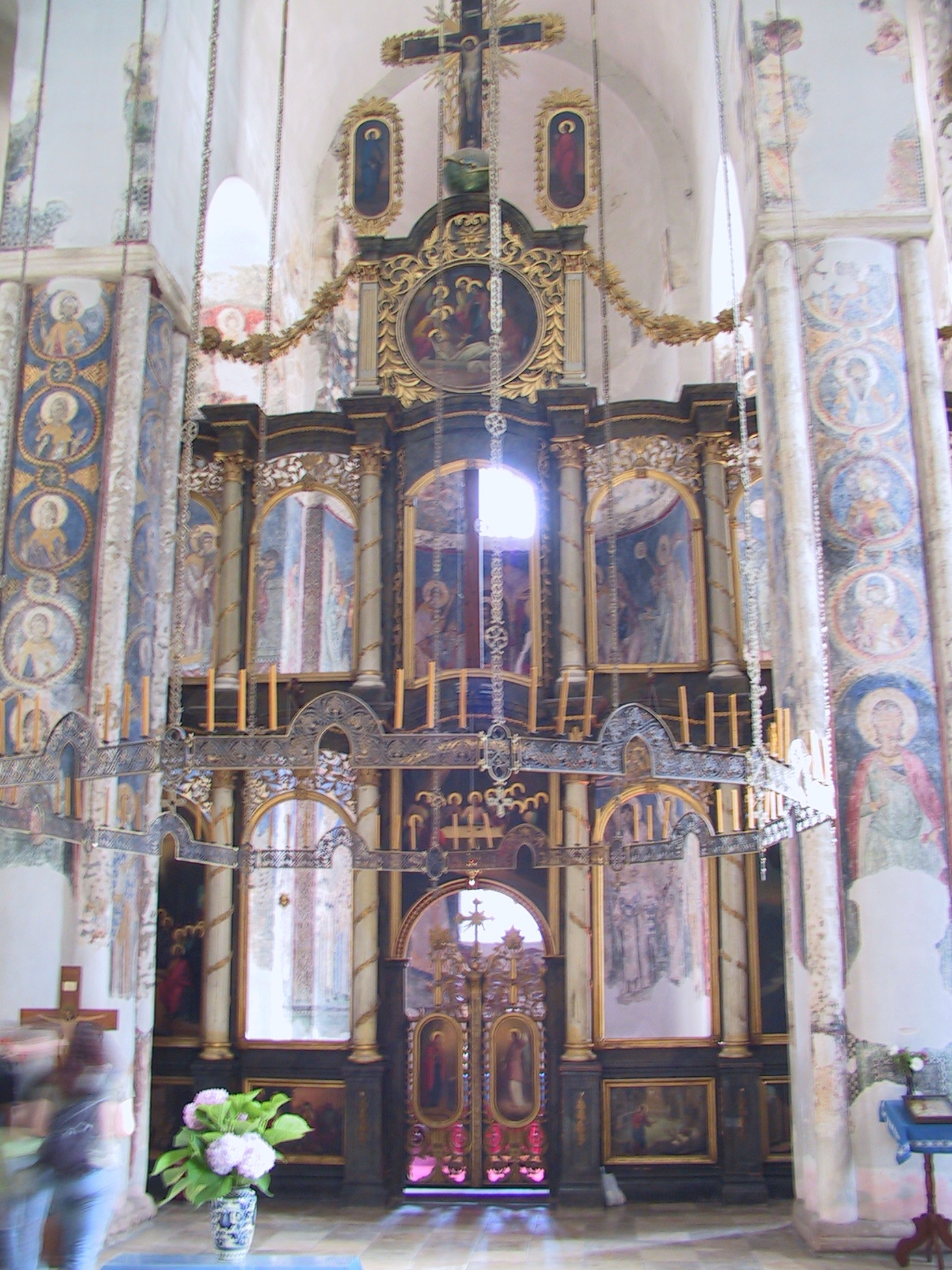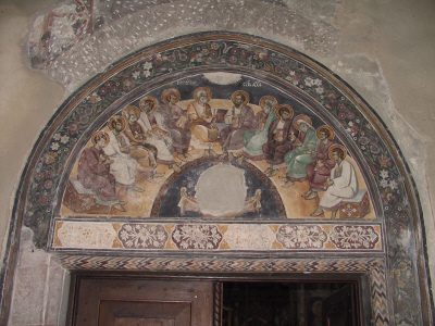 The interior of the churches is decorated with frescos. The paint was applied on the wet chalk, which conserves the colors very well - if the church is not destroyed itself. The paintings follow a certain scheme. There is a place for the donor of the church, another for the prophets, the evangelists, the Saint-Warriors, the scenes from the bible - they all have their specific place in an orthodox church. |
